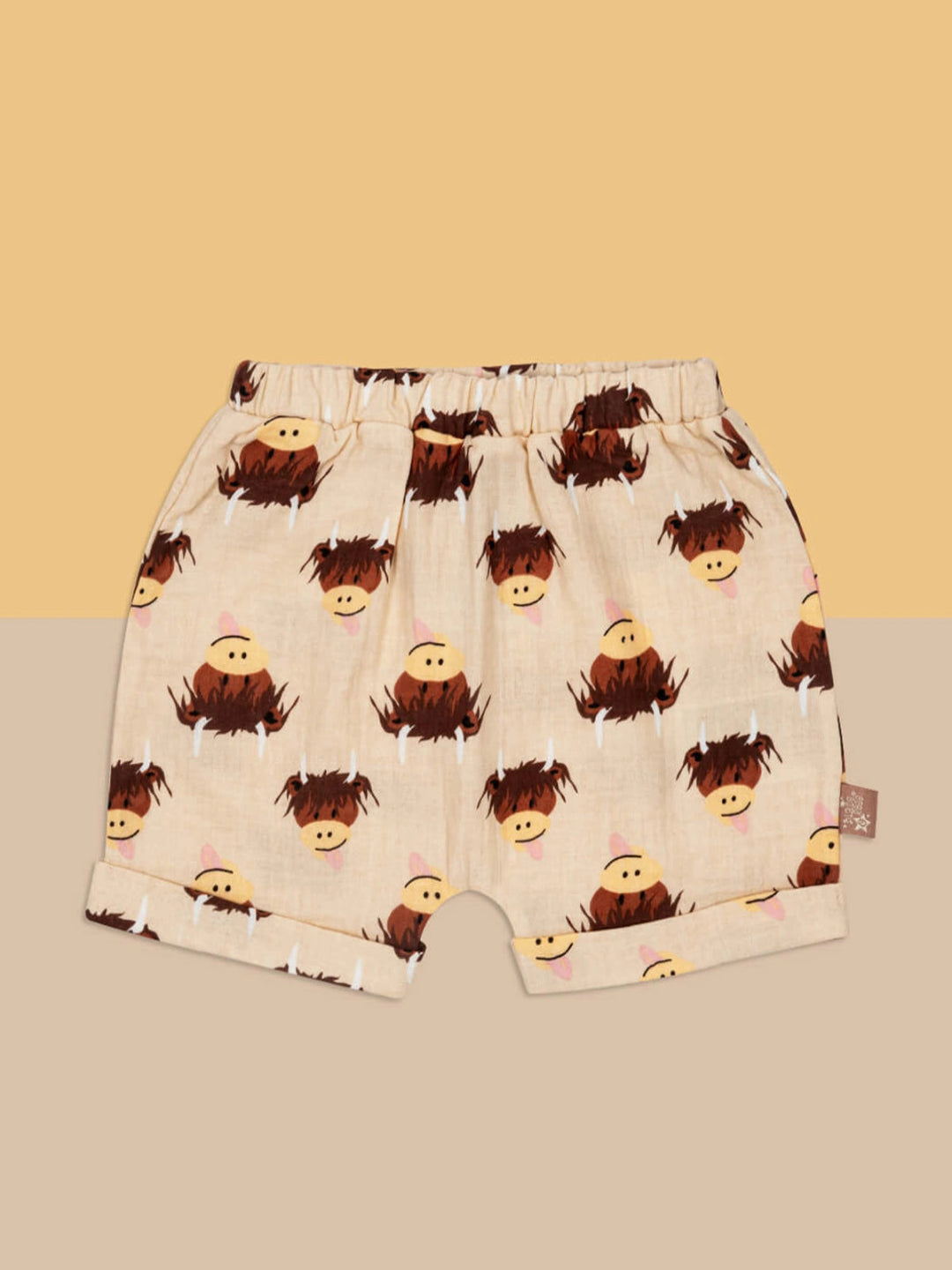 Soft 100% cotton muslin shorts, with the iconic Highland Cow character in an all over printed design. Just the thing for any little ones!