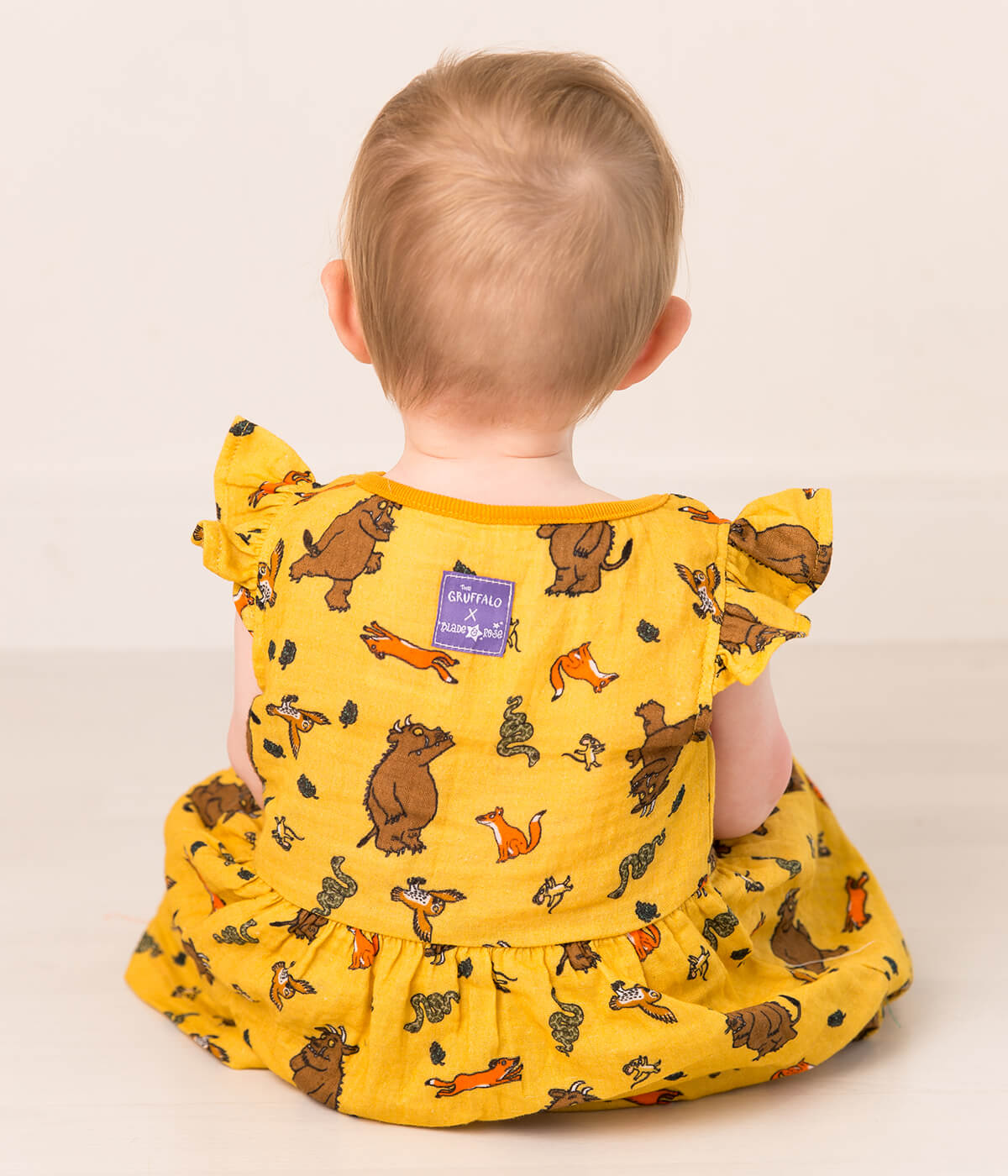 Soft cotton muslin sleeveless dress with all-over Gruffalo and friends printed on a soft mustard background. Keep them cool and stylish this summer.