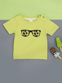 Our fresh pastel green colour is perfect for the sunnier days out and about. The tee has poppers on the shoulders for easier dressing. On the front, there is a print of a pair of sunglasses with palm trees within the lenses.